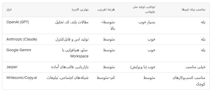 انتخاب بهترین ابزار وابسته به نوع محتوا، بودجه و نیازهای تیمی است. برای مقالات طولانی و پژوهشی، مدل‌های بزرگ مثل OpenAI و Anthropic مناسب‌ترند؛ برای محتوای بازاریابی و حجم بالا، Jasper و Writesonic کارآمدترند.