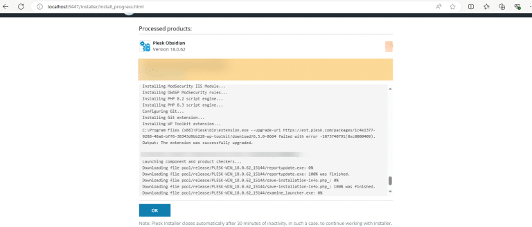 - بعد از پایان نصب، پیام «Plesk is successfully installed» را مشاهده خواهید کرد؛ روی OK کلیک کنید.