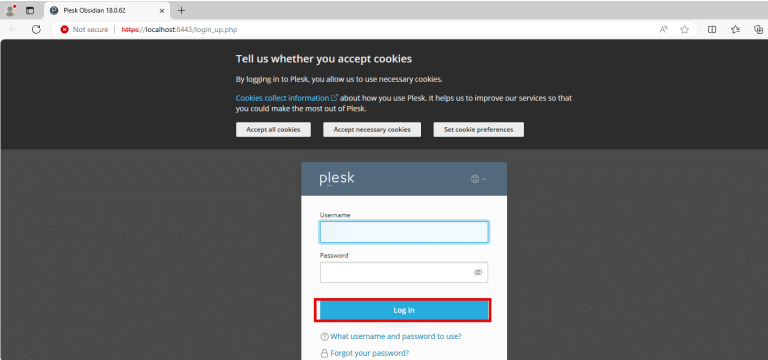 - از دسکتاپ یا منوی شروع روی آیکون Plesk کلیک کنید یا مرورگر را باز کرده و به: