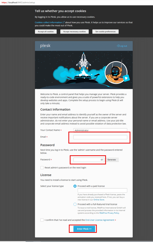 پیکربندی اولیه Plesk (ورود اول، لایسنس، اطلاعات ادمین)