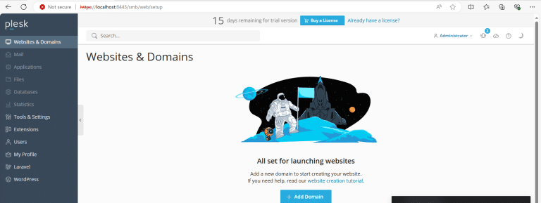 - پس از اتمام، به داشبورد Plesk هدایت میشوید.