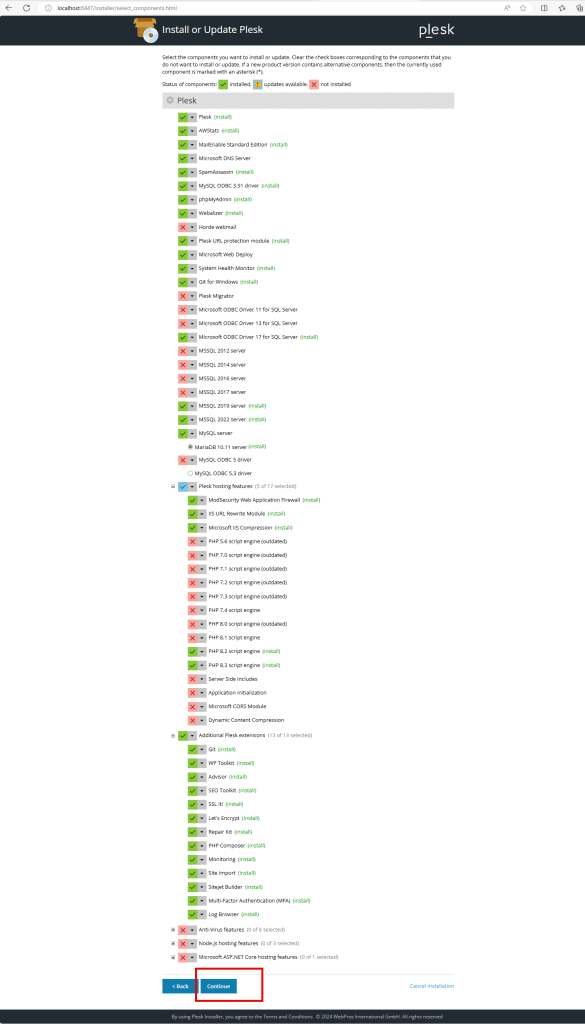 - پس از تایید مؤلفهها، روی Continue کلیک کنید تا دانلود و نصب بستهها آغاز شود.