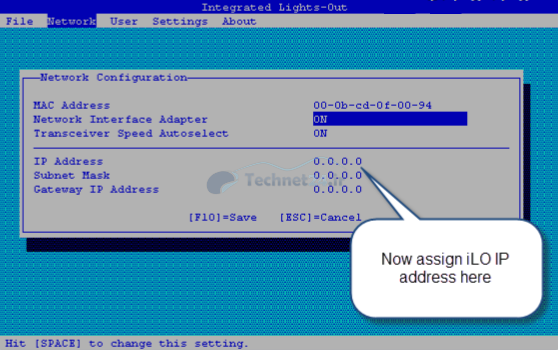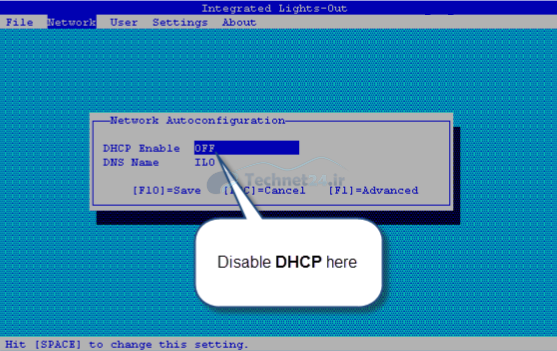 تنظیمات شبکه iLO را انتخاب کنید و تعیین کنید که از DHCP استفاده شود یا آدرس IP استاتیک وارد کنید.