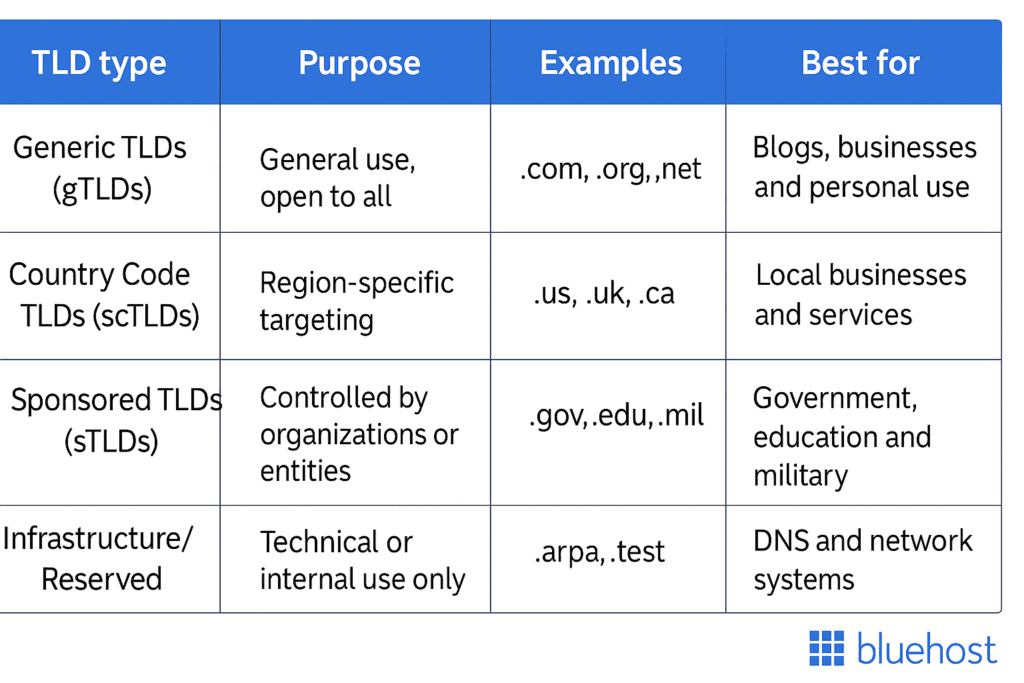 – پیشفرض (Legacy): شامل .com, .org, .net, .info, .biz. این پسوندها قدیمیترینها هستند و بهطور گسترده شناخته میشوند.