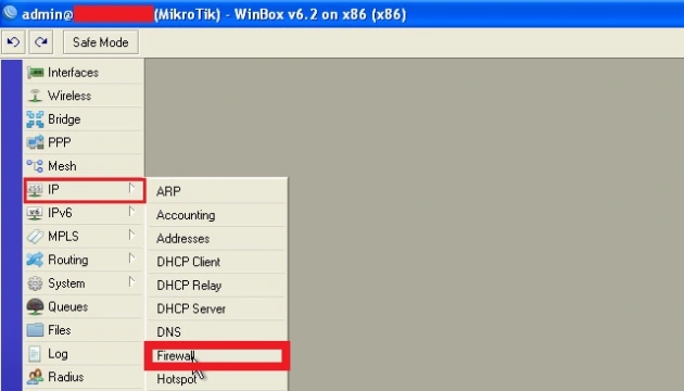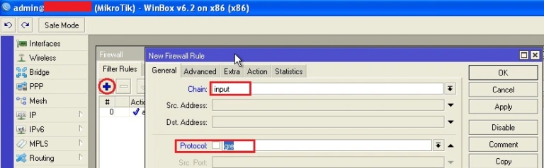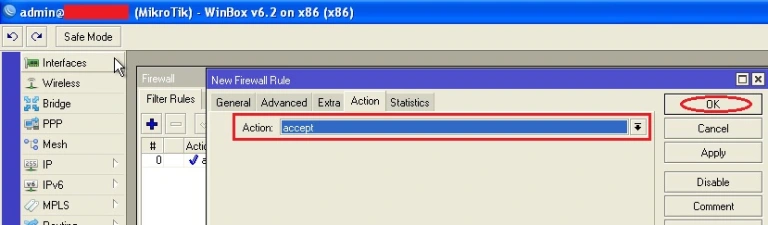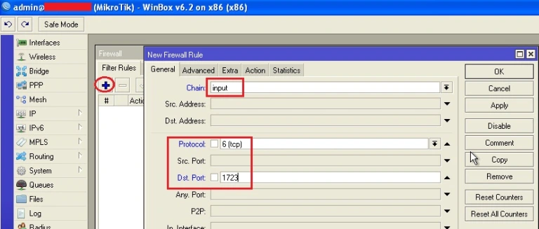 – به IP → Firewall بروید و در تب Filter Rules یک Rule جدید اضافه کنید: Chain را روی input قرار دهید، Protocol را tcp و Destination Port را 1723 وارد کنید. در تب Action مقدار accept را انتخاب و OK کنید.