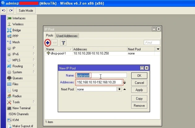 – برای افزودن Pool جدید روی علامت بعلاؤ کلیک کنید. برای نام می‌توانید pptp-pool انتخاب کنید. در فیلد Range بازه آدرس‌هایی را وارد کنید که می‌خواهید به کلاینت‌ها اختصاص یابد (مثال: 192.168.10.10-192.168.10.20). سپس OK کنید.