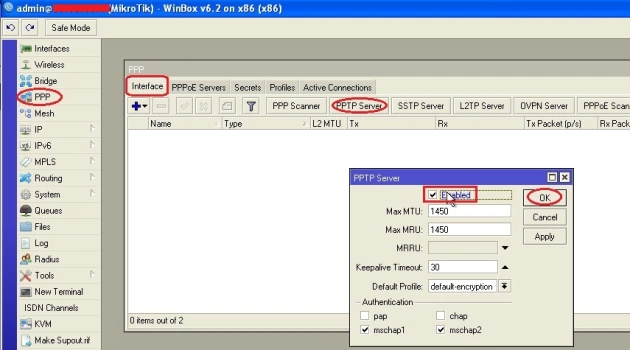 – به بخش PPP بروید. در تب Interfaces یا در بالای پنجره PPP گزینه PPTP Server را باز کنید و تیک Enabled را بزنید تا سرویس فعال شود.