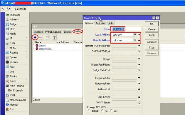 – در فرم Profile مقدار Local Address را روی آدرس روتر در تونل قرار دهید (مثلاً 192.168.10.1). برای Remote Address از Poolی که ساخته‌اید (pptp-pool) انتخاب کنید. همچنین می‌توانید DNS سرورهای موردنظر را وارد کنید (مثلاً 8.8.8.8, 8.8.4.4).