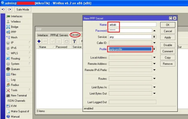– در پنجره PPP به تب Secrets بروید و روی به‌علاؤ کلیک کنید تا یک کاربر جدید بسازید. نام کاربری و پسورد را وارد کنید و Profile ساخته‌شده (pptp-profile) را انتخاب نمایید. سرویس را روی pptp قرار دهید. سپس OK کنید.