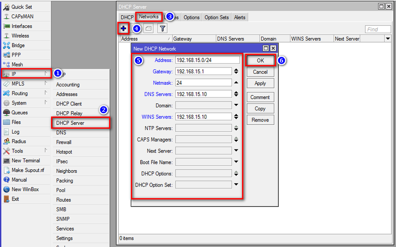 /ip dhcp-server network add address=192.168.1.0/24 gateway=192.168.1.1 dns-server=8.8.8.8