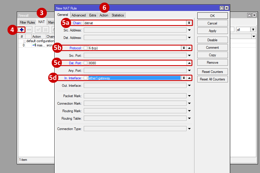 /ip firewall filter add chain=input connection-state=established,related action=accept /ip firewall filter add chain=input in-interface=ether1 action=drop /ip firewall filter add chain=forward connection-state=established,related action=accept /ip firewall filter add chain=forward in-interface=ether2 out-interface=ether1 action=accept