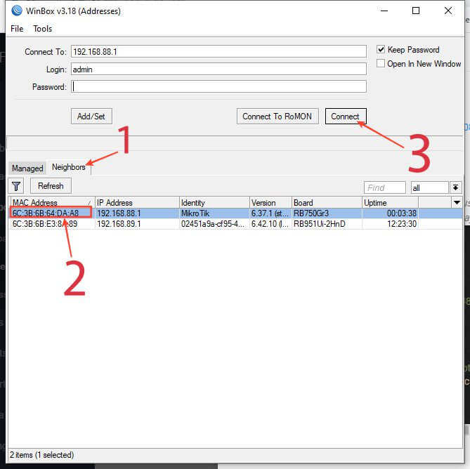 - با Winbox یا مرورگر وارد شوید. در صورت نمایش چندین MAC، از MAC برای اتصال مستقیم استفاده کنید.
