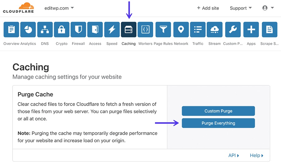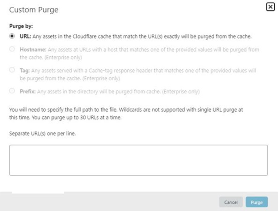 با انتخاب این گزینه، تمام فایلهای ذخیره شده در شبکه CDN کلودفلر حذف میشوند. این کار باعث میشود سایت برای مدتی کندتر شود زیرا باید مجدد کشسازی انجام شود.