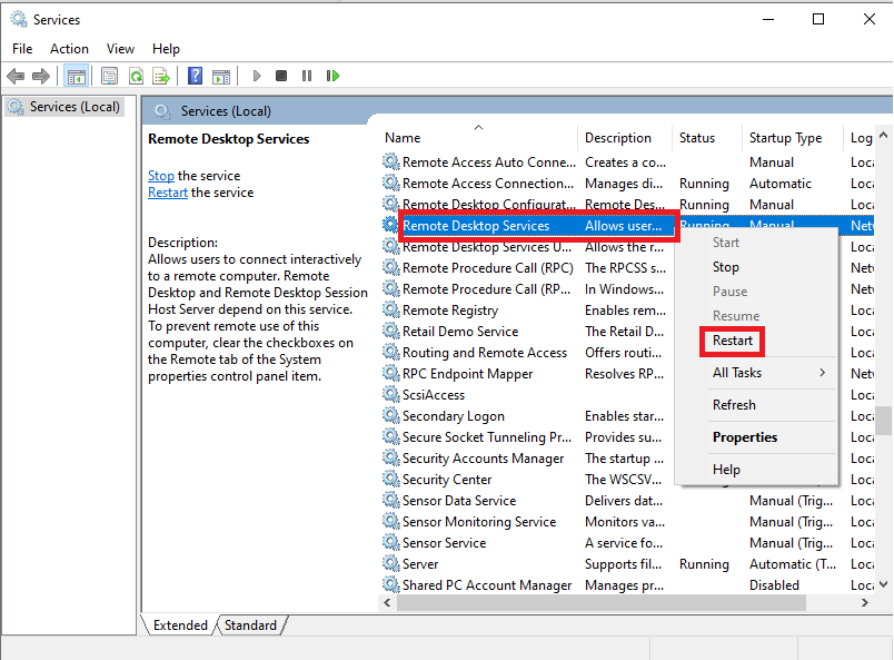 در صورت وجود سرویس‌های وابسته (مثلاً Remote Desktop Services UserMode Port Redirector) آن‌ها را هم چک کنید.