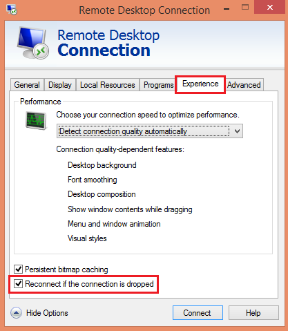 Show Options → Experience → تیک «Reconnect if the connection is dropped» را بزنید.