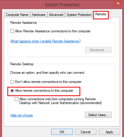 Control Panel → System and Security → System → Advanced system settings → Remote → Remote Desktop.