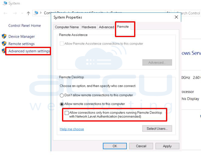 تیک «Allow connections only from computers running Remote Desktop with Network Level Authentication (recommended)» را بردارید.