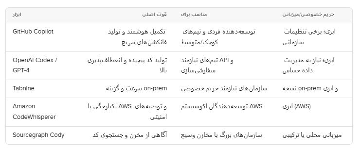 هوش مصنوعیهای کمکی برنامهنویسی میتوانند بهرهوری را بهطور چشمگیری افزایش دهند، اما باید با چارچوبهای کنترل کیفیت، امنیت و حاکمیت داده ترکیب شوند. انتخاب بهترین ابزار بستگی مستقیم به نیازهای پروژه (حریم خصوصی، اکوسیستم، بودجه، نیاز به سفارشیسازی) دارد — Copilot و Codex برای تولید عمومی و پیچیده مناسباند، Tabnine و Sourcegraph برای سازمانهایی که نیاز به میزبانی و آگاهی از مخزن دارند، و CodeWhisperer برای تیمهای AWS محور.