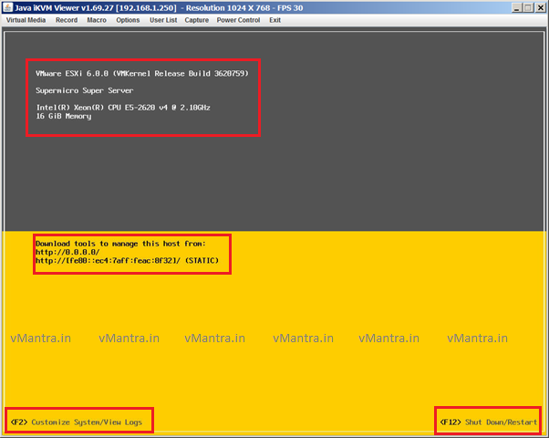 پس از ریستارت، به صفحهٔ Direct Console User Interface (DCUI) میرسید. این صفحه بهصورت متنی و با رنگهای زرد‑خاکستری نمایش داده میشود.