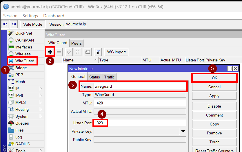 – در WinBox/WebFig: Interfaces > WireGuard > +