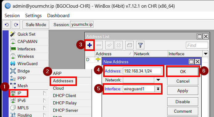 /interface wireguard add listen-port=13231 name=wireguard1 /ip address add address=192.168.34.1/24 interface=wireguard1