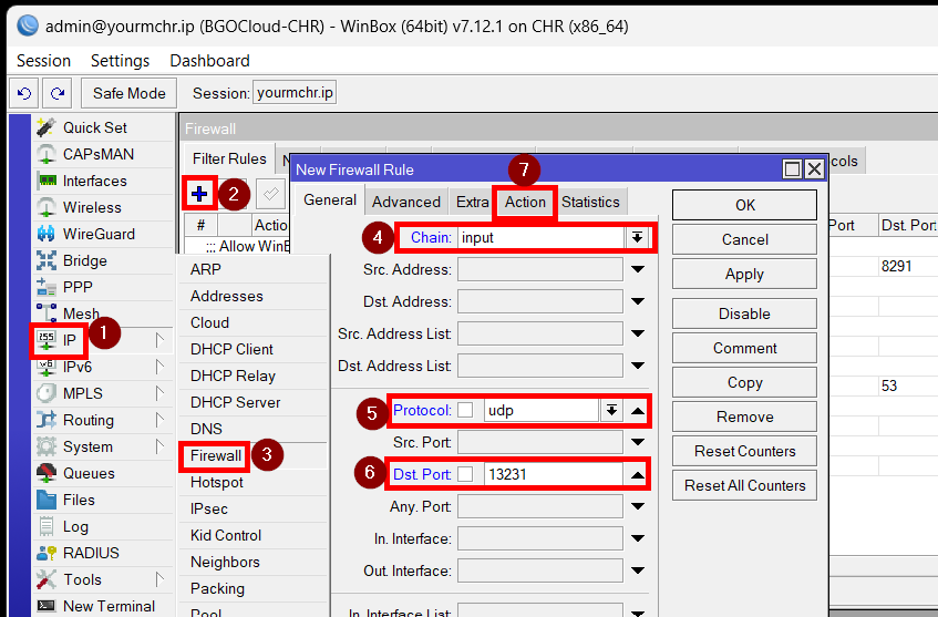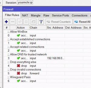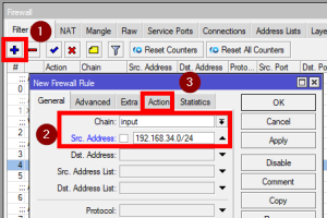 یا از طریق GUI: IP > Firewall > Filter Rules > +