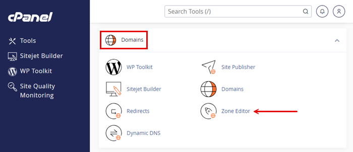 – روی Zone Editor کلیک کنید تا لیست دامنههای متصل به حساب نمایش داده شود.