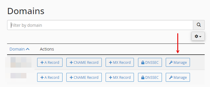 – در لیست دامنهها، کنار دامنهای که میخواهید TTL آن را تغییر دهید، دکمه Manage (یا آیکون قلم) را بزنید.