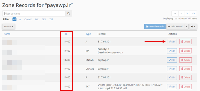- برای ردیف مورد نظر (معمولاً رکورد A یا CNAME) روی Edit کلیک کنید.