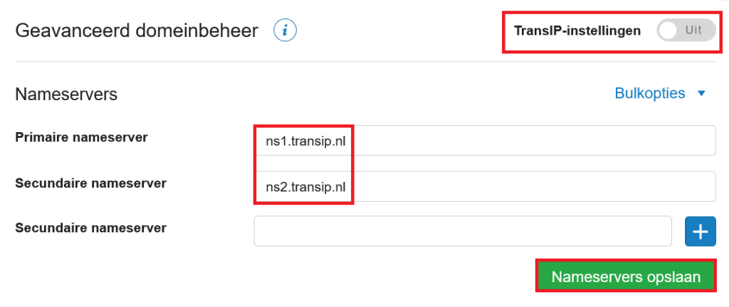در غیر این صورت (مدیریت DNS در TransIP یا ارائهدهنده خارجی)، رکوردها را مطابق بخش ‘DNS’ تنظیم کنید.