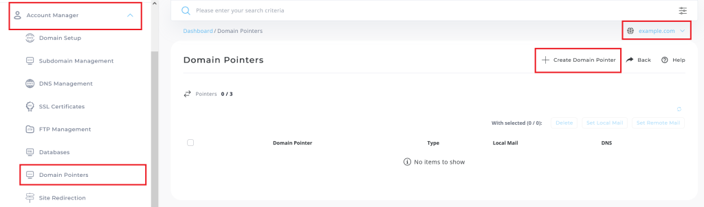 بهعنوان کاربر موردنظر وارد DirectAdmin شوید. سپس ‘Account Management’ > ‘Domain Pointers’ را انتخاب کنید و در بالا سمت راست ‘Create Domain Pointer’ را بزنید. در بالا سمت راست میتوانید تعیین کنید برای کدام دامنه قصد ساخت Pointer را دارید.