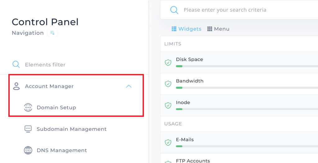 با کاربری که میخواهید دامنه را به آن وصل کنید وارد DirectAdmin شوید (اگر با حساب ادمین هستید، در منوی سمت چپ به ‘User Level’ سوییچ کنید). سپس روی ‘Account Management’ > ‘Domain Setup’ کلیک کنید.