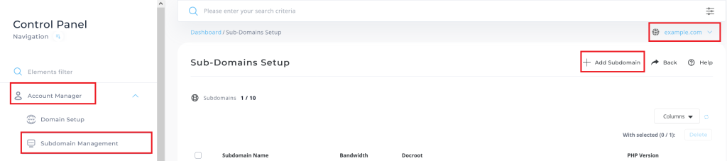 با کاربر موردنظر وارد DirectAdmin شوید (در صورت ورود با ادمین، به ‘User Level’ بروید). سپس ‘Account Management’ > ‘Subdomain Management’ > ‘Add Subdomain’ را انتخاب کنید.