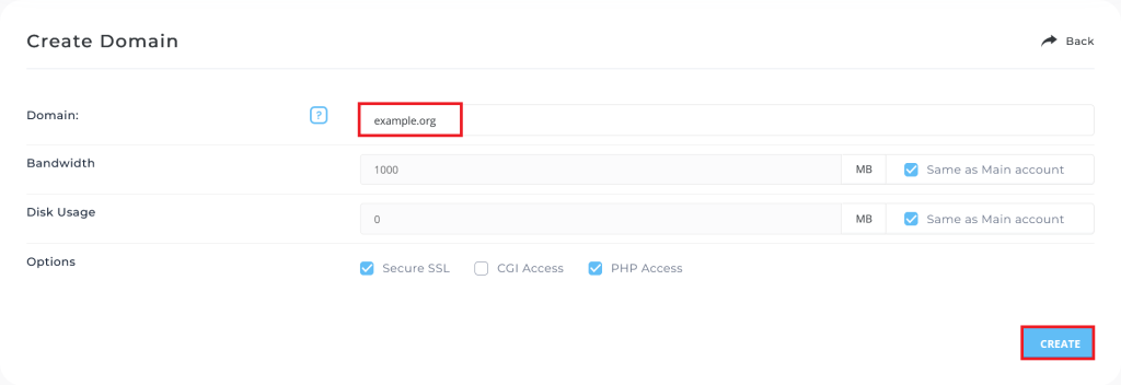 نام دامنهای که میخواهید اضافه کنید وارد کنید و سایر گزینهها را مطابق نیاز تنظیم کنید. سپس روی ‘create’ کلیک کنید.