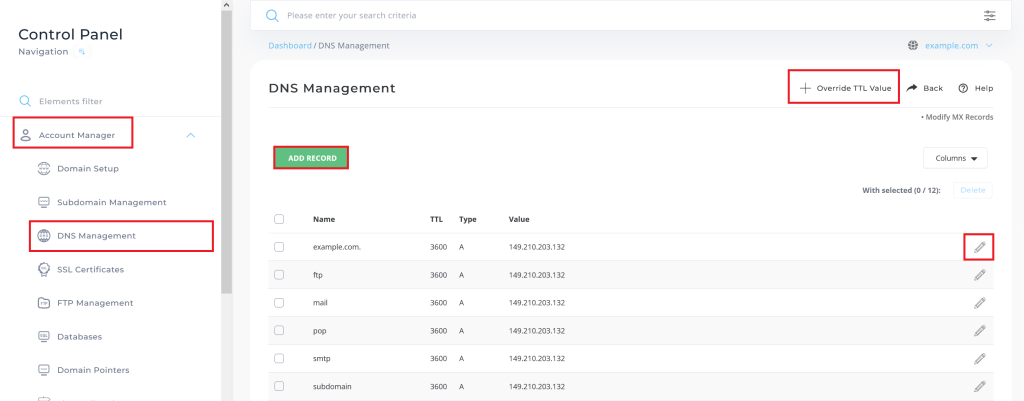 برای افزودن یا ویرایش رکورد DNS یا تغییر TTL، از حسابی که دامنه در آن قرار دارد به ‘Account Management’ > ‘DNS Management’ بروید.