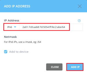 در پنجره پاپآپ «add IP address» نوع ‘IPv6’ را انتخاب کنید، آدرس IPv6 کپیشده را وارد کنید. ماسک شبکه /64 را به انتهای آدرس اضافه کنید و روی «add IP» کلیک کنید.