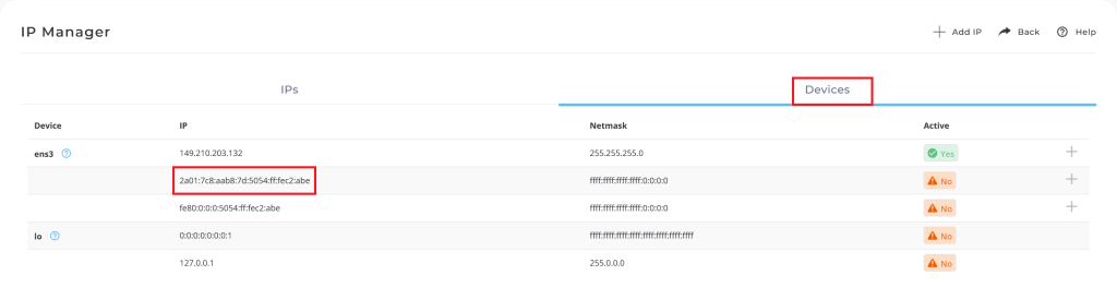 به تب «Devices» بروید و آدرس اصلی IPv6 (یا هر آدرس IPv6 دلخواه در صورت وجود چند آدرس) را کپی کنید.