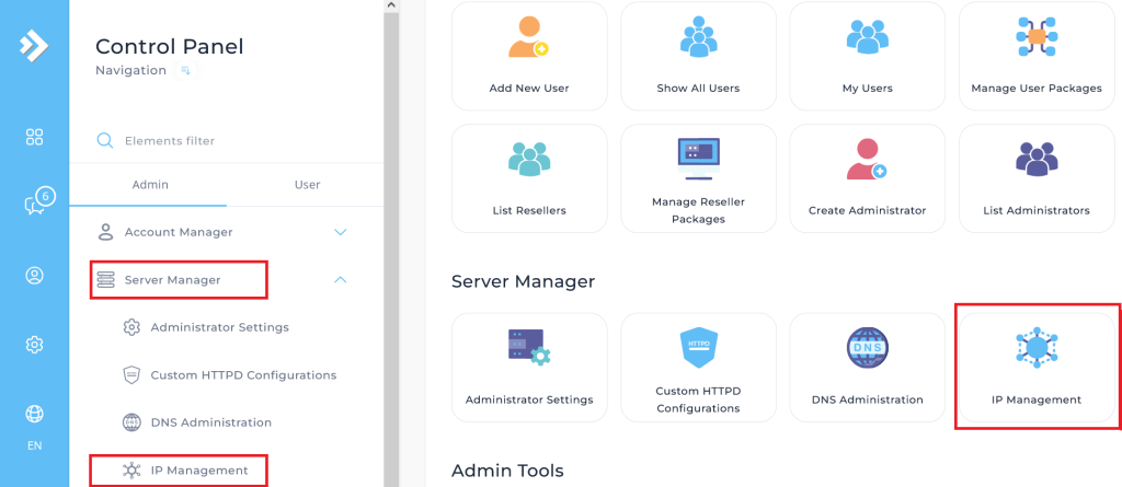 با سطح مدیریت (Admin Level) وارد DirectAdmin شوید و روی «IP Management» کلیک کنید.