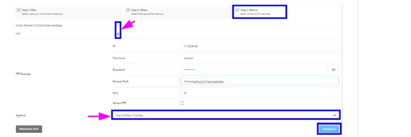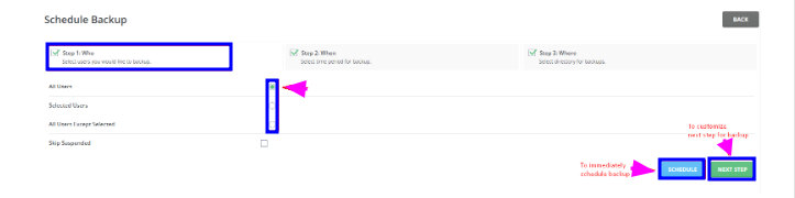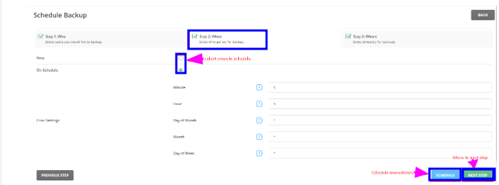 – برای صرفهجویی در فضا ممکن است برخی گزینهها را غیرفعال کنید. پس از تنظیم، روی Schedule یا Create کلیک کنید تا پشتیبان زمانبندی یا ایجاد شود.