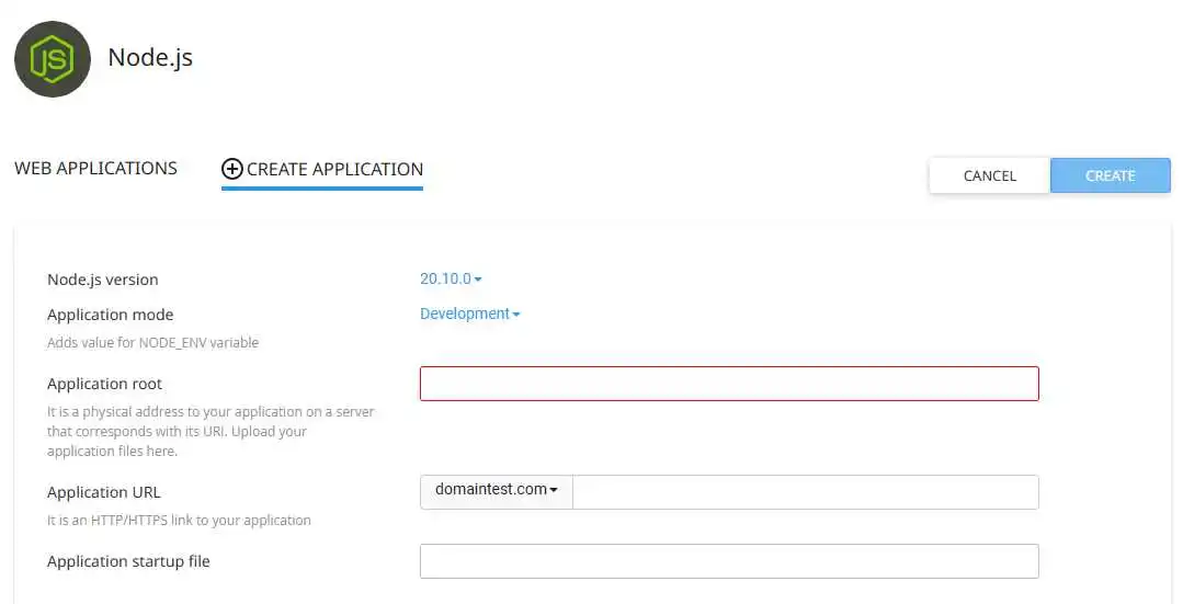 – Application root: مکان ریشهٔ برنامهٔ Node.js شما نسبت به ریشهٔ FTP. توصیه میشود برنامهٔ Node.js را در پوشهٔ public_html قرار ندهید.