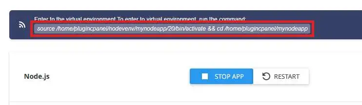 استفاده از خط فرمان و ترمینال بخش جداییناپذیر اکوسیستم Node.js است. برای دسترسی به محیط برنامه از طریق ترمینال، به ترمینال وب cPanel یا از طریق یک کلاینت SSH متصل شوید و دستور نشاندادهشده را کپی کنید تا وارد محیط برنامه شوید.