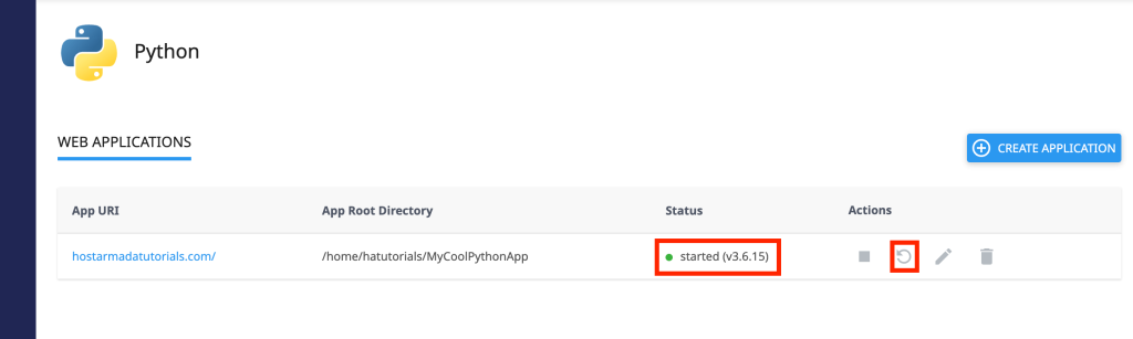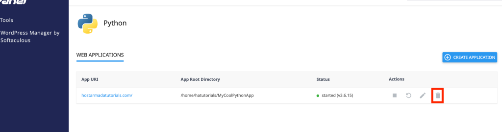 – Delete: با آیکون سطل زباله اپ را حذف کنید. حذف اپ باید فقط از طریق همین رابط انجام شود چون حذف دستی فایلها ممکن است به virtualenv و ساختار مرتبط آسیب بزند.