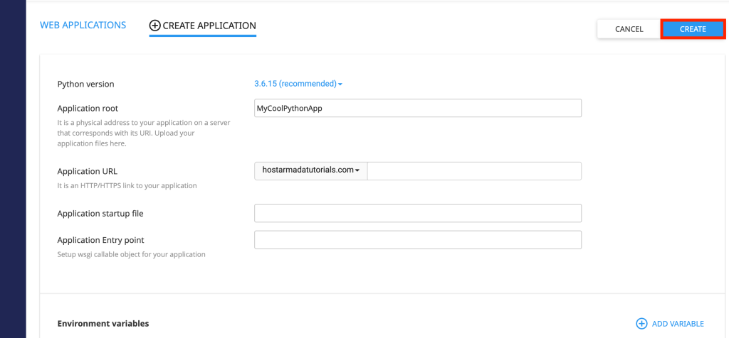 – Application startup file (اختیاری): نام فایل استارت اپ را وارد کنید؛ در صورت خالی ماندن این فیلد، cPanel فایل passenger_wsgi.py پیشفرض میسازد. مثال: app.py