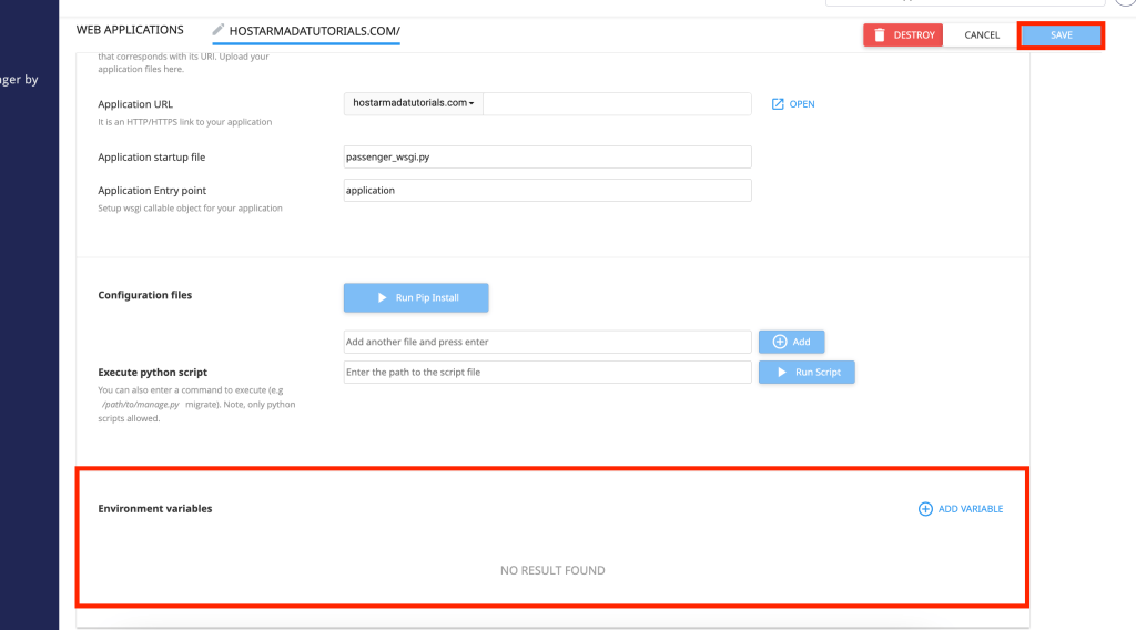 – Edit: با آیکون قلم میتوانید تنظیمات اپ، متغیرهای محیطی و فایلهای پیکربندی را ویرایش کنید؛ در این بخش امکان اجرای pip install نیز وجود دارد. پس از اعمال تغییرات روی «SAVE» کلیک کنید تا تغییرات ذخیره شوند.