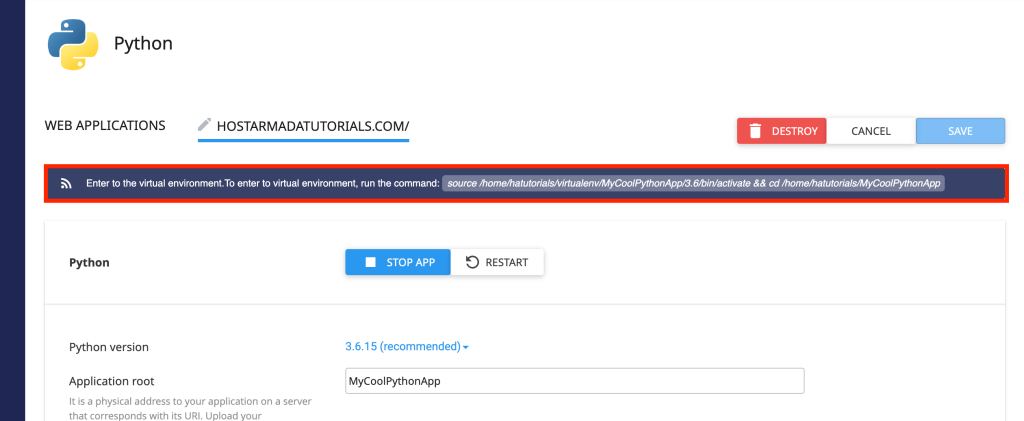 برای دسترسی به محیط مجازی معمولاً باید از طریق SSH وارد حساب خود شوید و دستور فعالسازی محیط (که در صفحه اپ نمایش داده میشود) را اجرا کنید؛ مثلاً: