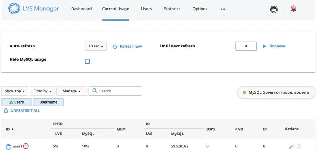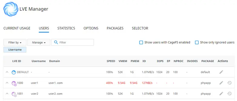 در LVE Manager، میتوانید لیست کاربران و منابع مصرفی آنها را مشاهده کنید. این اطلاعات شامل میزان استفاده از CPU، RAM و I/O است.