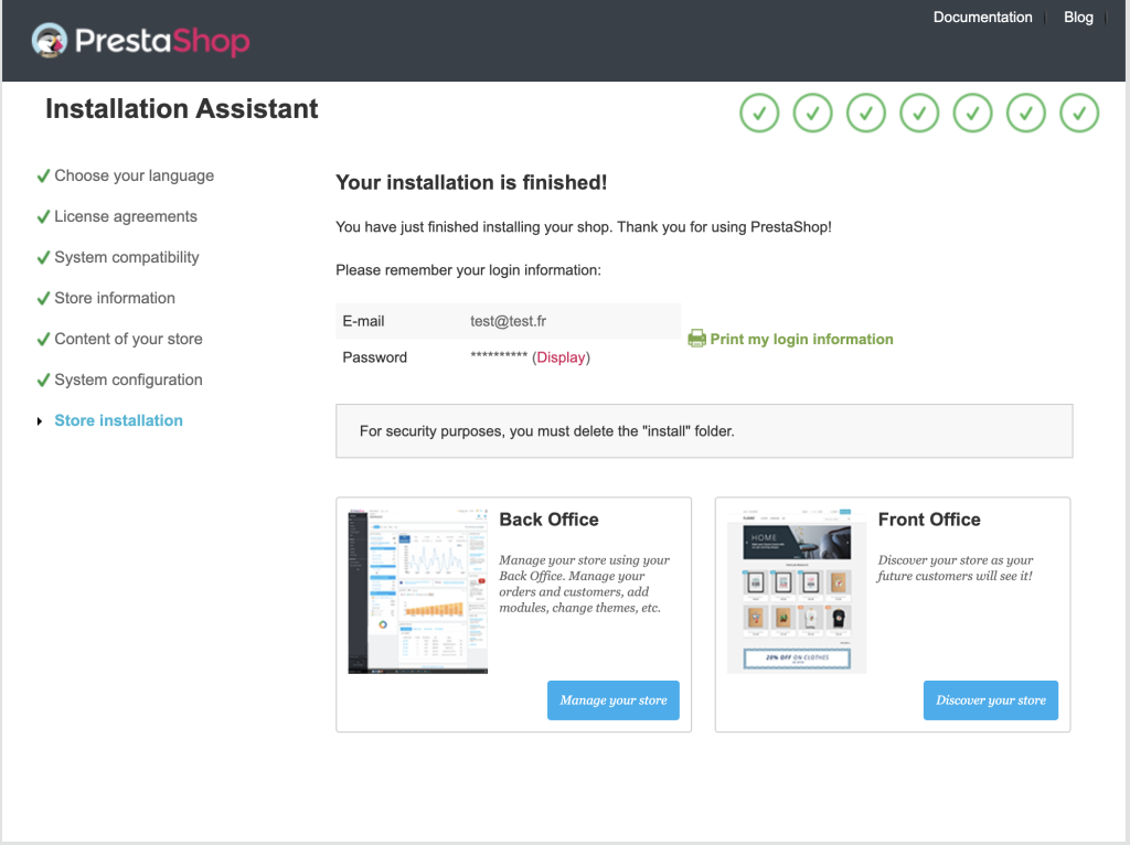 – بازدید از دامنه در مرورگر؛ پیروی از مراحل نصب گرافیکی شامل چک محیط، وارد کردن اطلاعات DB، تنظیمات فروشگاه و ایجاد حساب مدیریت.