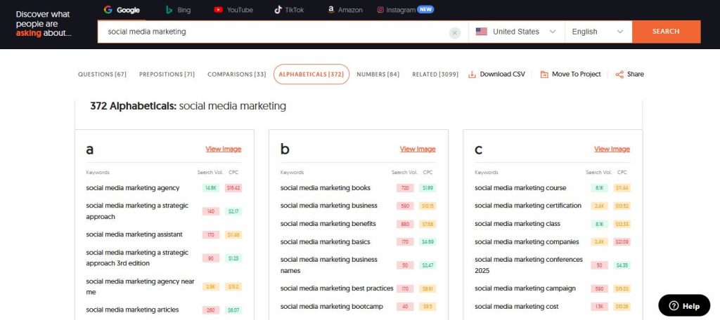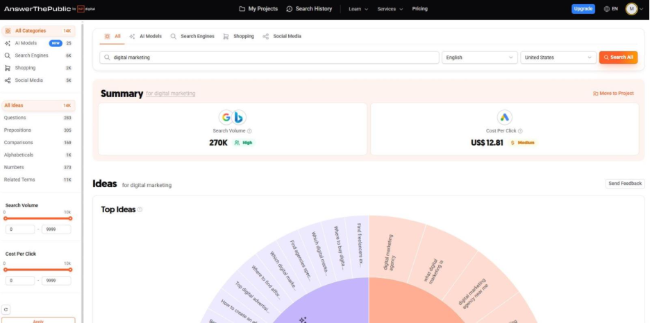 AnswerThePublic: ابزاری قدرتمند برای تحقیق کلمات کلیدی و ایدهپردازی محتوا که با جمعآوری و بصریسازی پرسشها، تکمیلهای جستجو و عبارات مرتبط، به شما کمک میکند موضوعات پرتقاضا و شکافهای محتوایی را شناسایی کنید. با استفاده از گزارشهای دستهبندیشده (چه، چگونه، چرا، مقایسهها و پیشوند/پسوند) و خروجیهایی آماده برای تولید عنوان و ساختار مطلب، میتوانید محتوای سوالمحور، بهینهشده برای سئو و هدفمند تولید کنید تا ترافیک ارگانیک و نرخ تبدیل سایتتان افزایش یابد.